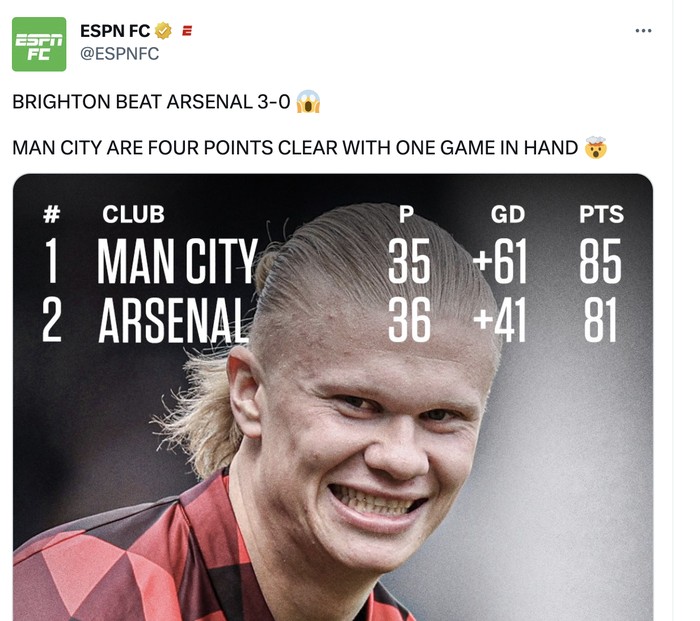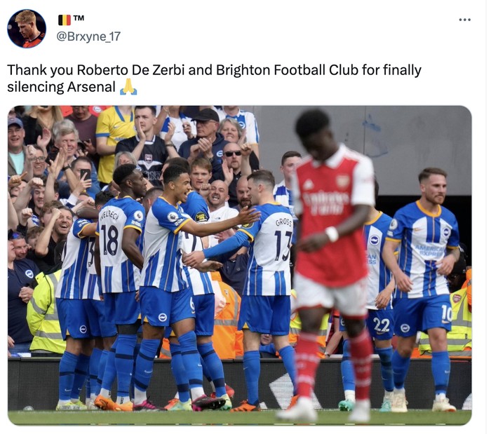 Fans City tentu berterima kasih pada Brighton yang mengalahkan Arsenal dan membuat City selangkah lagi juara. Foto: Twitter