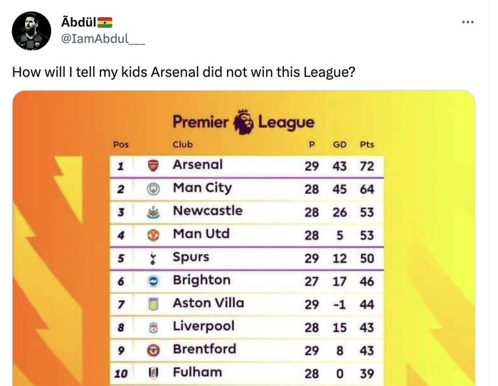 Sempat unggul 8 poin dari City dan kukuh di puncak Liga Inggris, entah bagaimana kini Arsenal terkejar hampir tidak ada harapan lagi juara. Foto: Twitter