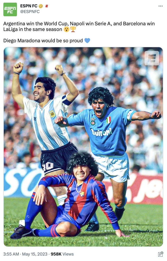 Uniknya, semua yang dibela almarhum Diego Maradona juara pada musim ini, mulai dari Argentina juara Piala Dunia, Napoli dengan Serie-A, dan Barcelona dengan LaLiga. Foto: Twitter