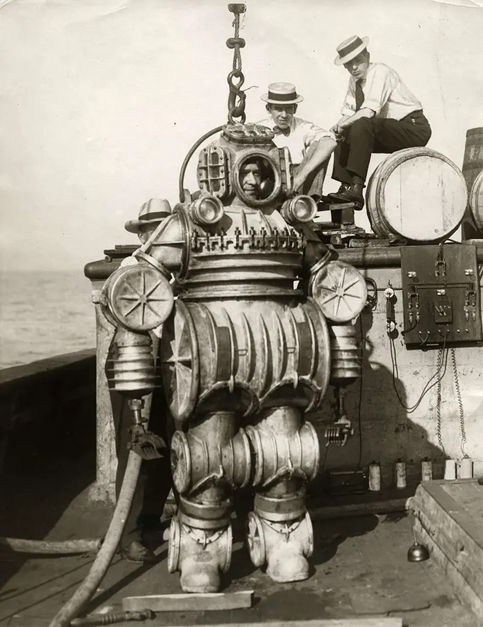 Ini adalah pakaian selam milik Jerman di tahun 1920-an. Pakai material metal, memiliki pengisian listrik dan sistem perlindungan tekanan.Foto: Rarehistoricalphotos