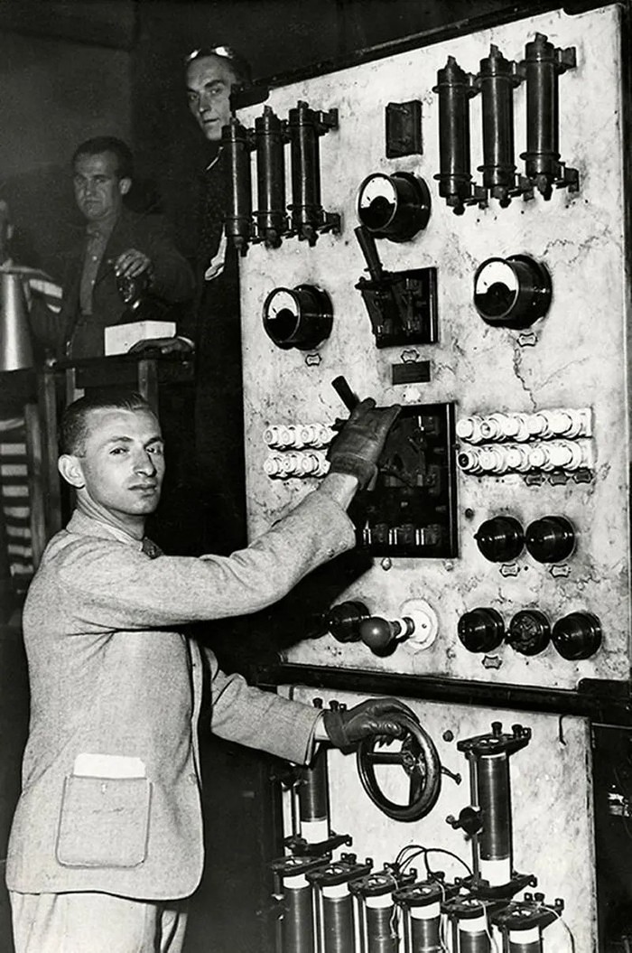 Insinyur Hongaria Stefan Nailed di dekat mesin yang dia temukan konon membuat orang dan benda mati tidak terlihat. 1935 Foto: Rarehistoricalphotos