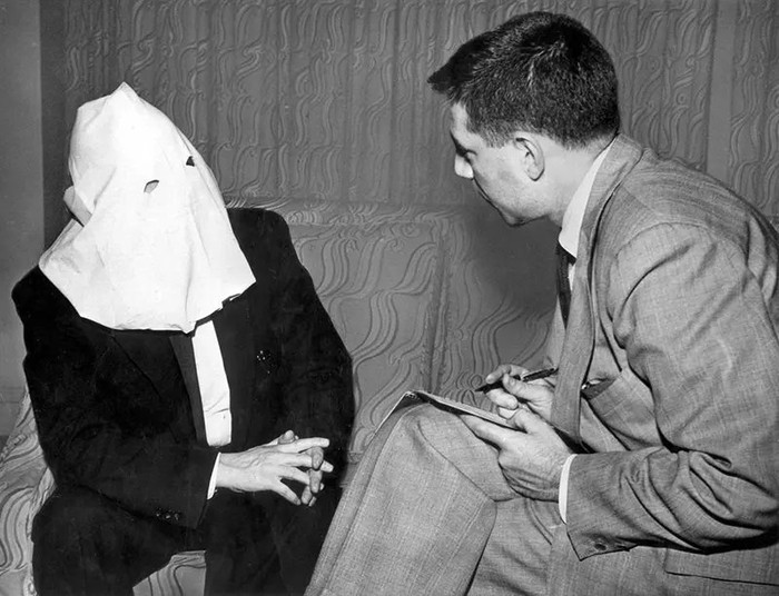 Kriptografer Soviet Igor Guzenko, 1945. Dalam foto ini, dia menyembunyikan wajahnya untuk wawancara dengan Soul Pett dari Associated Press. Guzenko bekerja di kedutaan Soviet di Ottawa dan melarikan diri ke Barat pada tahun 1945. Dia membawa lebih dari seratus dokumen dan informasi rahasia dari jaringan mata-mata Soviet di Kanada; 29 mata-mata ditangkap dan dihukum sesudahnya. Guzenko menerima hadiah yang mengesankan, rumah besar, dan suaka politik. Foto: Rarehistoricalphotos