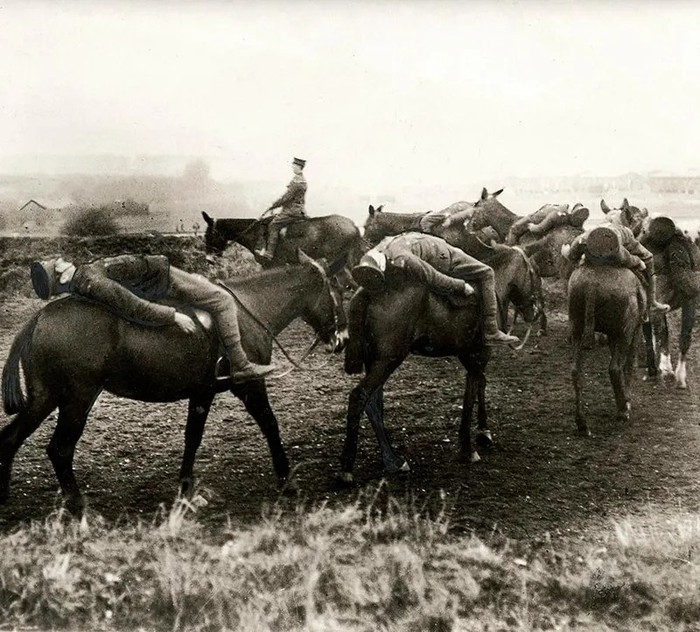 Prajurit Artileri Kuda Kerajaan Inggris di atas kuda. Hewan-hewan itu ternyata sangat patuh sehingga membiarkan para prajurit melakukan trik seperti ini, 1915. Foto: Rarehistoricalphotos