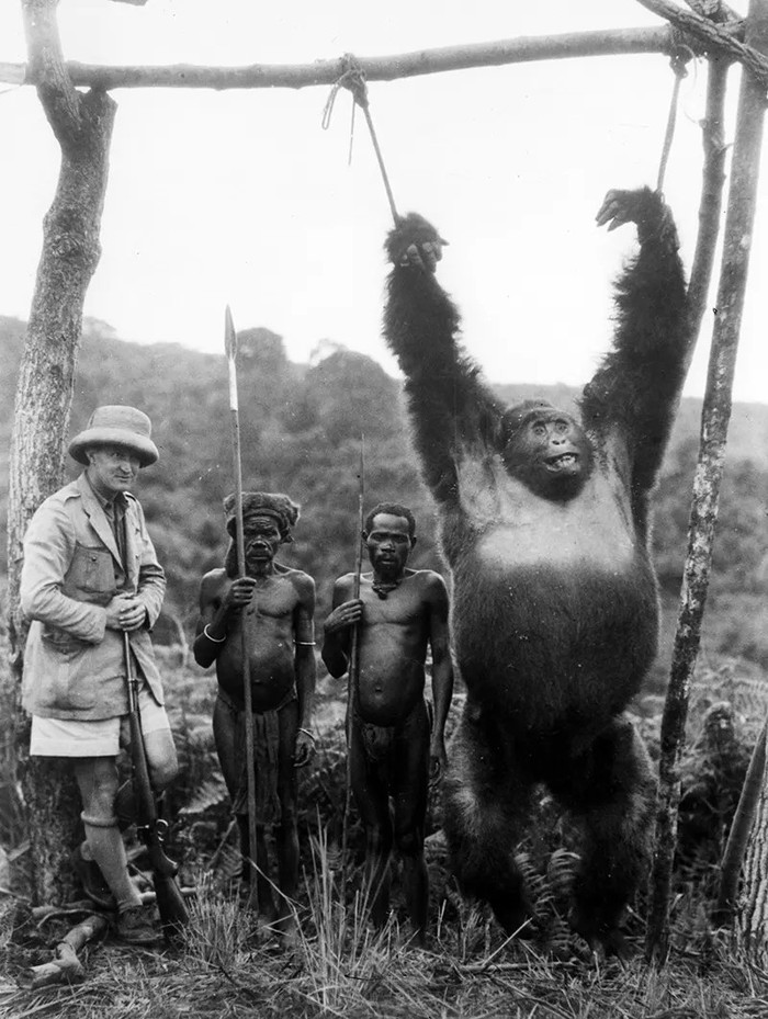 Pelancong Italia Attilio Gatti dengan dua pigmi sewaan dan seekor gorila yang ditangkap oleh mereka di Kongo Belgia, 1930. Foto: Rarehistoricalphotos
