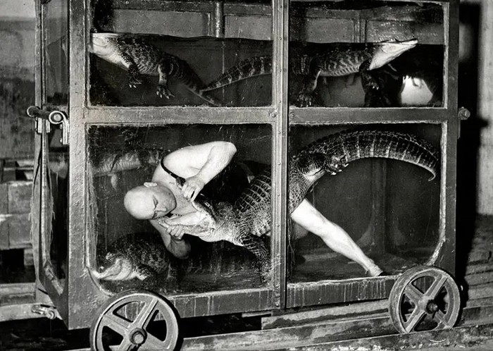 Seorang pemain sirkus di mobil akuarium bersama buaya, Berlin, 1933. Foto: Rarehistoricalphotos