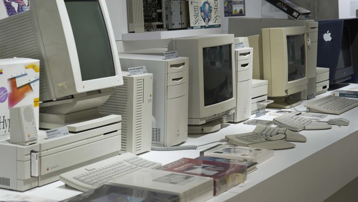 Komputer antik Apple Macintosh terlihat dipamerkan di Apple Museum di Warsawa, Polandia, Senin (16/5/2023). Β