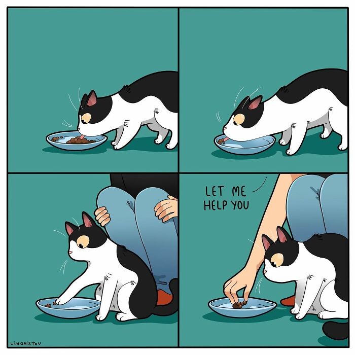 Ah iya lagi, kalau dia kesulitan ambil makanannya, kita juga yang bantuin ya. Foto: (Bored Panda).