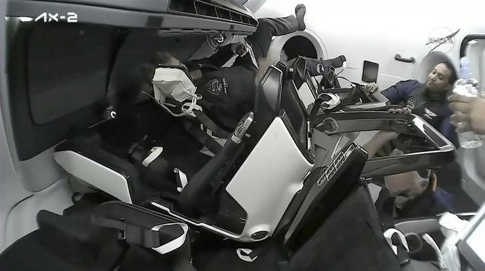 Setelah keempatnya mencapai stasiun luar angkasa dalam kapsul, mereka akan menghabiskan lebih dari seminggu sebelum kembali ke bumi dengan pendaratan di lepas pantai Florida. (NASA TV via AP) Β
