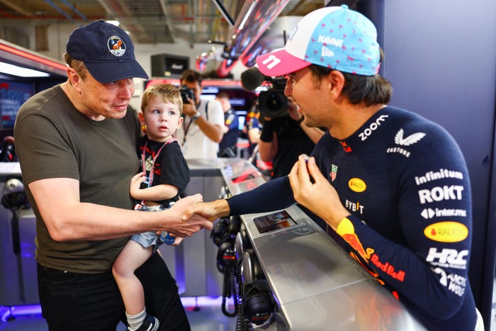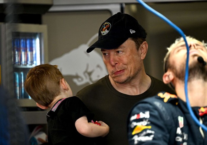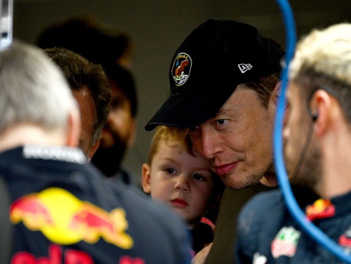 Elon Musk berada di Paddock sebelum latihan terakhir jelang Grand Prix F1 Miami di Miami International Autodrome pada awal Mei ini di Miami, Florida. Tampak dia menggendong sang anak, X AE A-XII. Foto: Getty Images
