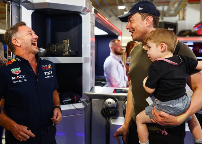 Red Bull Racing Team Principal Christian Horner berbicara dengan Elon Musk di garasi sebelum latihan terakhir menjelang Grand Prix F1 Miami. Foto: Getty Images