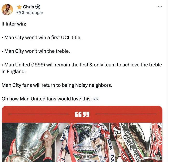 Jika Inter menang, Manchester United tentu akan senang karena mereka masih akan menjadi satu-satunya tim Inggris yang treble piala bergengsi. Foto: Twitter