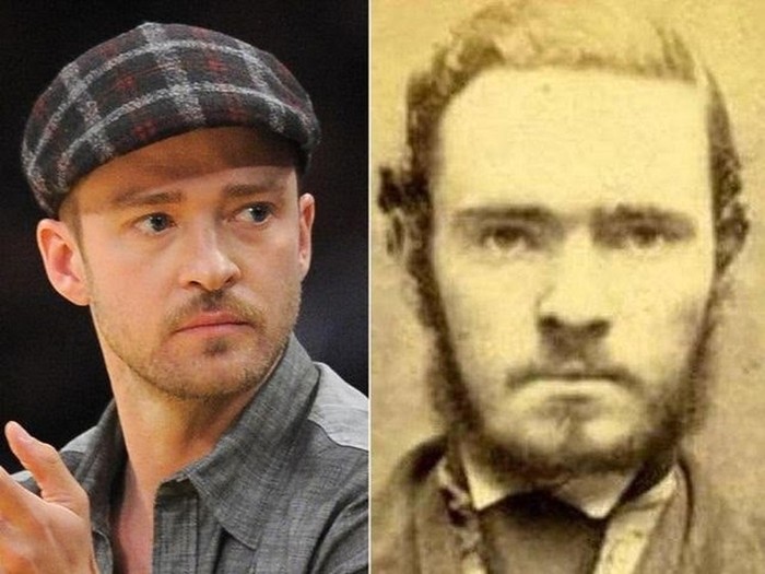 Penyanyi Justin Timberlake sangat mirip dengan pria di masa silam yang dijepret di sebelah kanan. (istimewa/playbuzz) Β