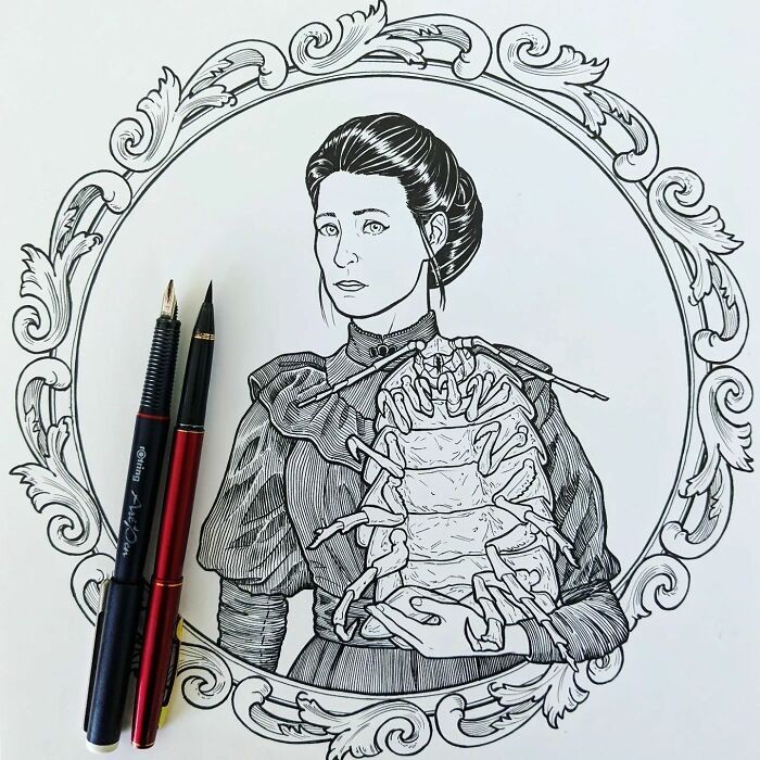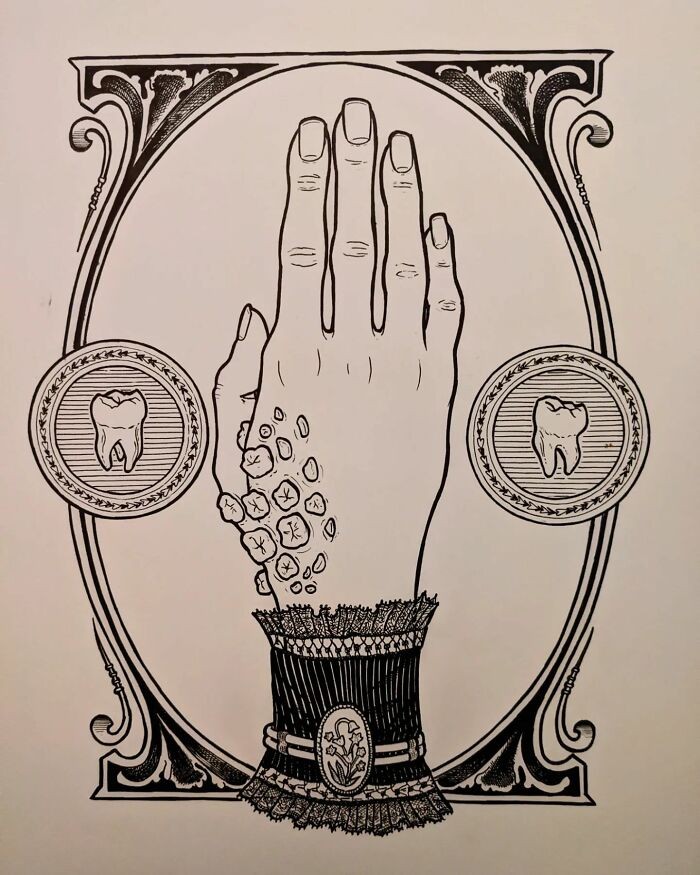 "Gambar ini sebenarnya didasarkan pada mimpi yang saya alami bertahun-tahun yang lalu. Di dalamnya, saya adalah seorang gadis di sekolah swasta dengan gigi yang tumbuh di kedua tangan saya. Teman sekelas saya akan menggoda saya dengan memanggil saya "Chompers" dan secara vertikal saling memukul. bagian tangan mereka ini dua kali berulang-ulang. Saya selalu ingin melakukan sesuatu dengan gambarnya, jadi ini dia." kata Ed Harrington Foto: Ed HarringtonΒ