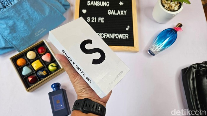 Kotak kemasan Samsung Galaxy S21 FE 5G masih tipis karena hanya menyertakan kabel data USB Type C. Foto: Adi Fida Rahman/detikINET