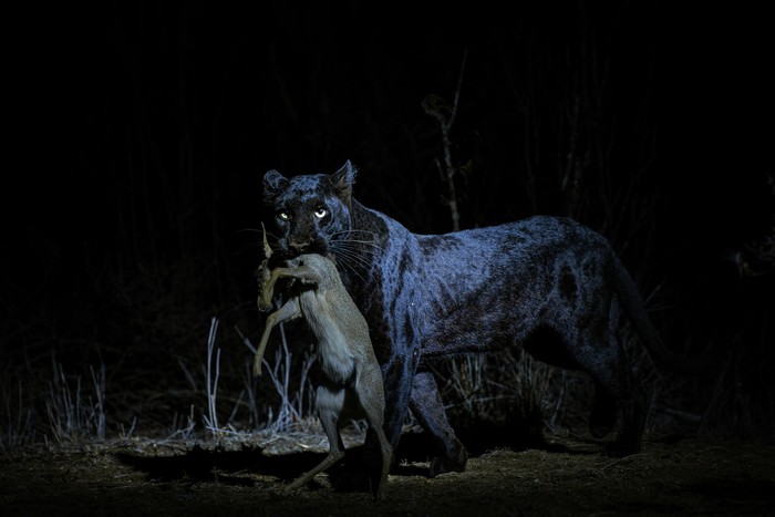 Finalis Terrestrial Wildlife:Β Leighton Lum.Β Sekilas luar biasa dari spesies yang sudah sulit ditangkap: Hanya 11% macan tutul dunia memiliki bulu hitam (melanisasi), dan bahkan lebih kecil kemungkinannya untuk menemukan macan tutul seperti itu di Afrika. Beruntung bagi kami, fotografer iniβdengan bantuan pemandu ahlinyaβmemiliki keterampilan yang diperlukan untuk mengabadikan pemandangan yang tidak terduga dari perburuan yang sukses ini dalam kegelapan total.Β BigPicture Photography Competition