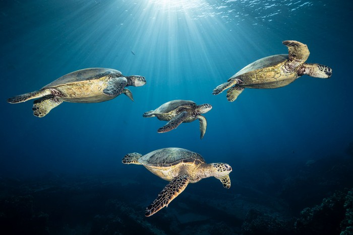 Finalis kategori Aquatic Life: Renee Capozzola. Empat penyu hijau ( Chelonia mydas ) berenang dengan tenang di perairan Maui. Meskipun tidak biasa melihat mereka di perairan Hawaii, tempat mereka berkembang biak berkat perlindungan yang ketat, sangat jarang melihat lebih dari dua berenang bersama. Penyu hijau pada dasarnya adalah makhluk soliter begitu mereka mencapai usia dewasa, berpasangan hanya sebentar untuk pacaran dan berkembang biak. Foto: BigPicture Photography Competition