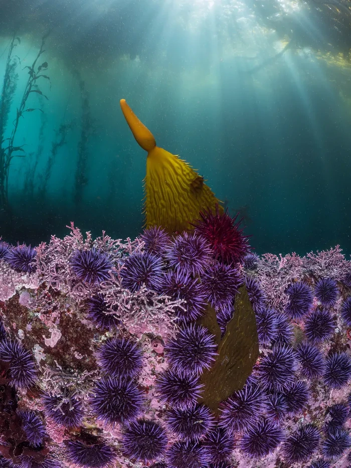 Pemenang kategori Aquatic Life: Kate Vylet. Bulu babi sering difitnah penyebab paling nyata hilangnya hutan rumput laut, melahap alga, dan mengganti hutan subur dengan gundul bertabur duri. Namun dalam foto ini kita melihat bagaimana bulu babi termasuk dalam hutan rumput laut seperti halnya rumput laut itu sendiri; lebih penting lagi, mereka memainkan peran penting sebagai detritivor β memakan ganggang mati dan memberi makan kehidupan laut yang lebih tinggi di rantai makanan. Pada akhirnya, bulu babi mencoba bertahan hidup di lautan yang berubah seperti rumput laut; hilangnya rumah hutan kelp mereka adalah konsekuensi dari perubahan iklim yang juga mereka derita. Foto: BigPicture Photography Competition