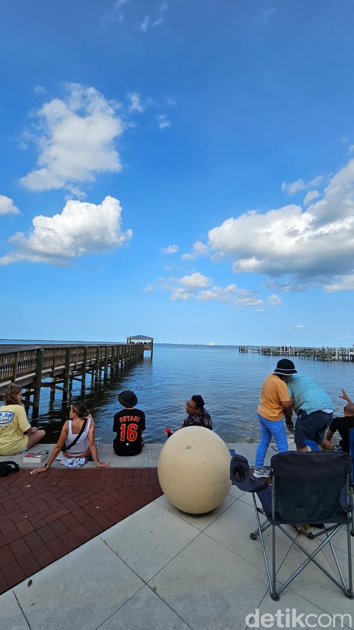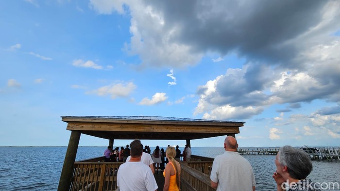 Menyaksikan peluncuran Satelit Satria-1 sembari duduk di tepi dermaga. Foto: Agus Tri Haryanto/detikINET