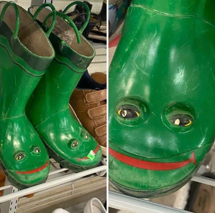 Sepatu bot dengan wajah kodok yang mencurigakan. Foto: Reddit via Bored Panda