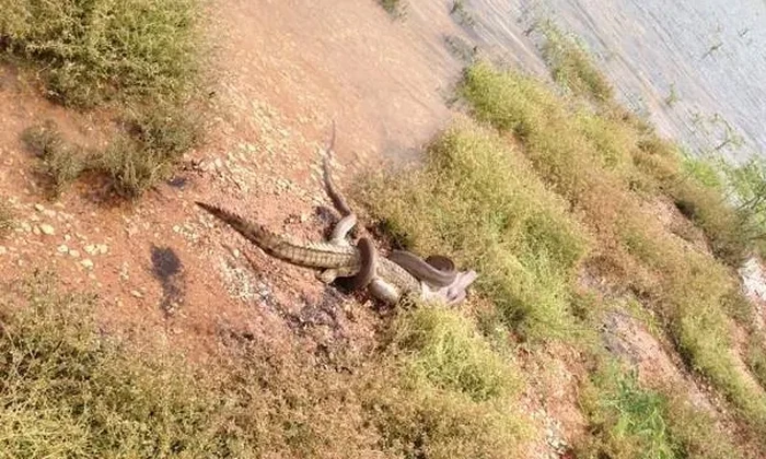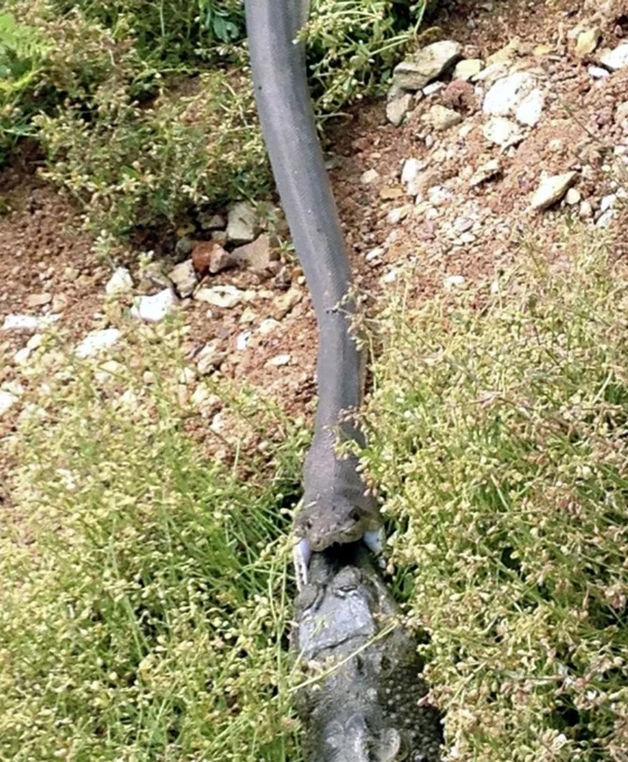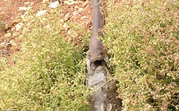 Duel dua predator ini terjadi di di Moondarra, dekat Gunung Isa, di utara Queensland. Keduanya bergulat hingga salah satu di antaranya mati. Momen tersebut sempat diabadikan penduduk lokal bernama Tiffany Corlis Foto: Tiffany Courlis via Sina Mobile