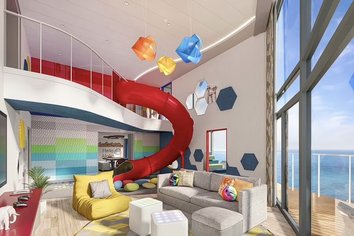 Terdapat berbagai pilihan kamar, termasuk menawarkan kabin terbesar di laut, 'townhouse' tiga lantai yang dapat menampung delapan orang dan memiliki perosotan merah sepanjang 35 kaki dari atas ke bawah. Foto: Royal Carribean