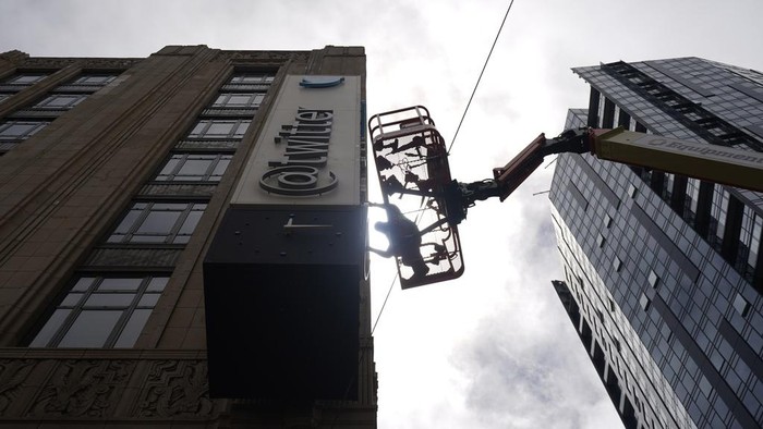 Seorang pekerja mencopot karakter dari tanda di gedung markas Twitter di San Francisco. Elon Musk tak pernah berhenti membuat keputusan kontroversial usai mencaplok Twitter. Setelah membatasi akses tweet per harinya, dia mengganti burung biru yang ikonik dengan logo X per hari Senin (24/7/2023). AP/Godofredo A. VΓ‘squez