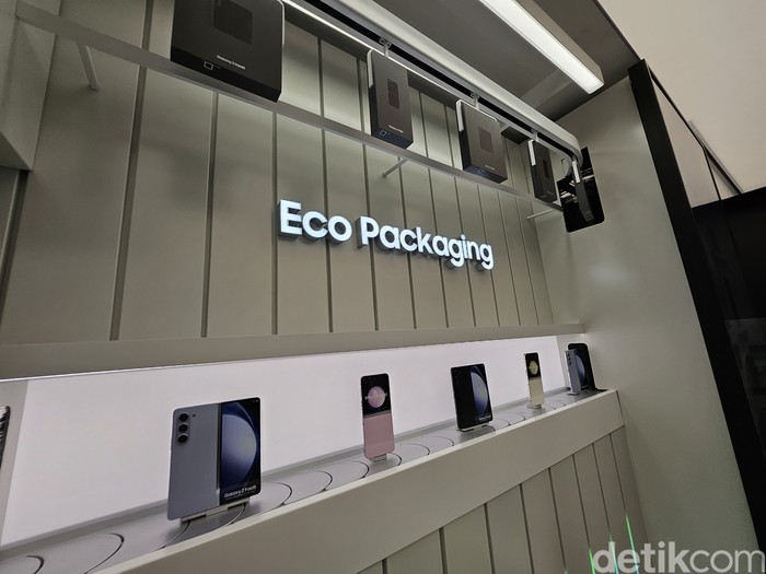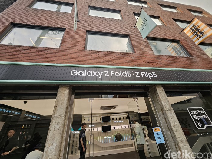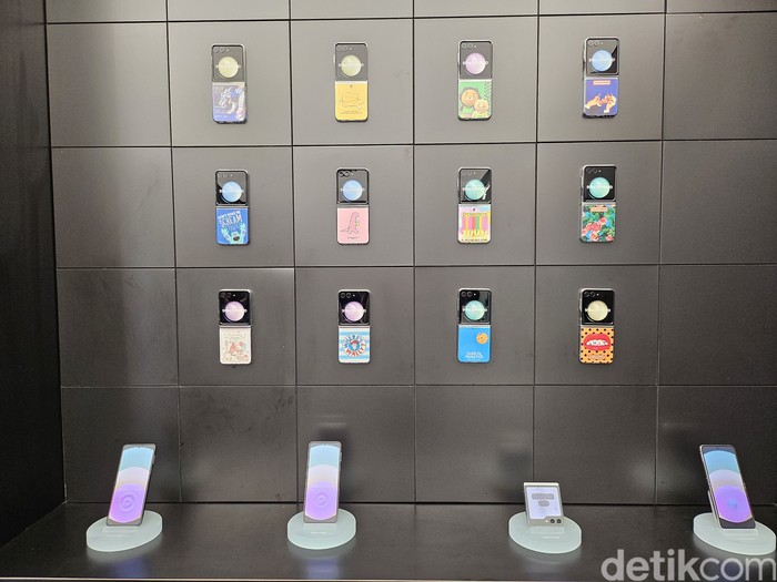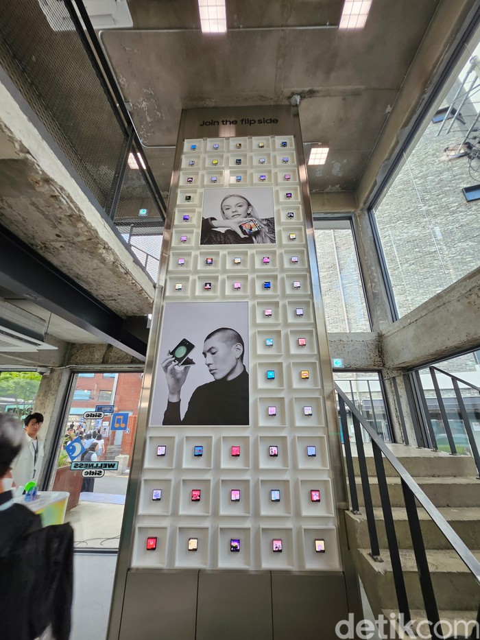 Begitu masuk langsung disambut dengan dinding yang dipenuhi Galaxy Z Flip 5 hingga ke atap. Foto: Virgina Maulita Putri/detikINET
