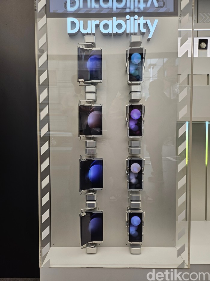 Ada juga instalasi mesin yang tidak berhenti membuka tutup Galaxy Z Fold 5 dan Galaxy Z Flip 5. Kedua ponsel ini sendiri diklaim dapat dibuka tutup hingga 200.000 kali dan telah mendapatkan sertifikasi dari Bureau Veritas. Foto: Virgina Maulita Putri/detikINET