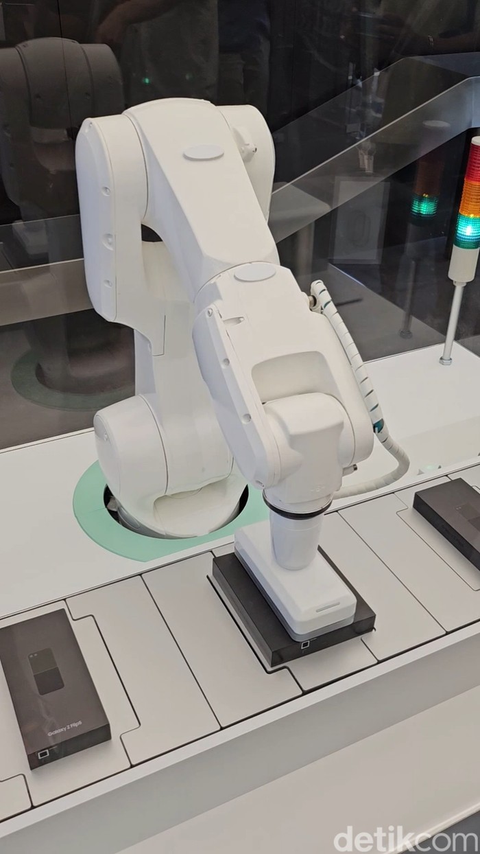 Di ujung conveyor belt ada robot pintar yang bertugas mengecap kotak kemasan Galaxy Z Fold 5 dan Galaxy Z Flip 5 dengan warna sesuai produknya. Foto: Virgina Maulita Putri/detikINET