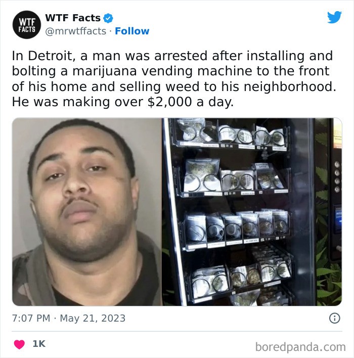 Di Detroid, seorang laki-laki di tangkap karena menjual marijuana dengan vending machine. Dia meraup uang USD 2.000 atau sekitar Rp 30,2 juta setiap harinya. Foto: mrwtffacts via Bored Panda