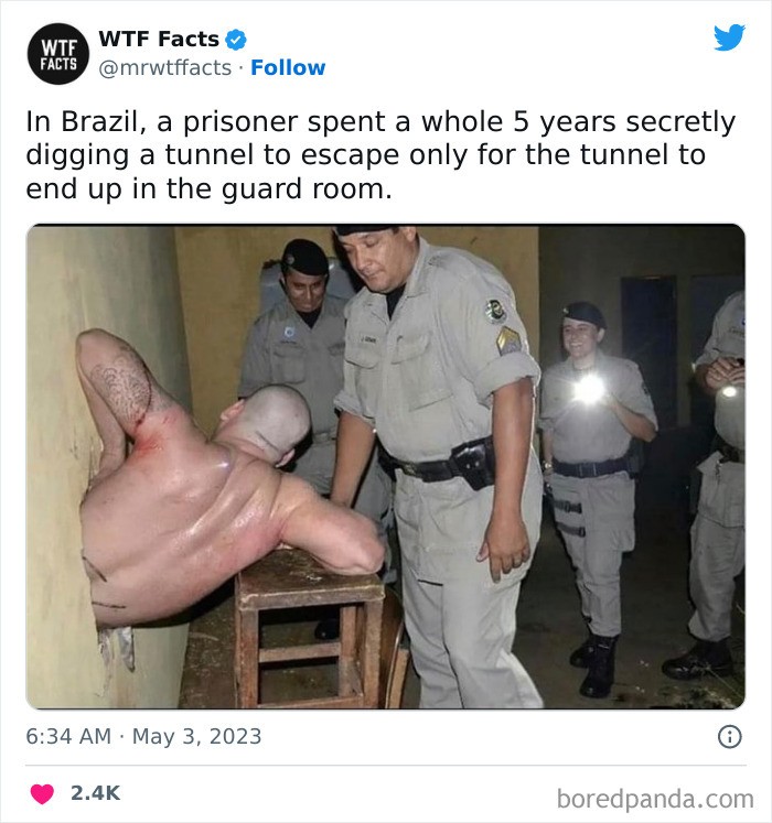 Seorang tahanan di Brasil diam-diam menggali terowongan untuk kabur. Tahunya lubang itu mengarah ke ruang penjaga. Foto: mrwtffacts via Bored Panda
