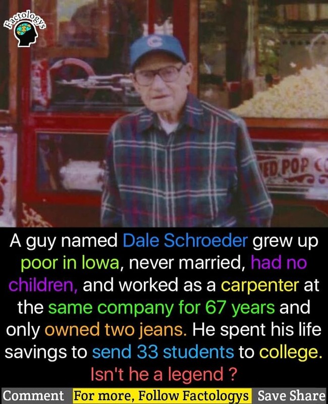 Seorang laki-laki bernama Dale Schroeder tidak pernah menikah, tidak punya anak, dan menjadi tukang kayu untuk perusahaan yang sama selama 67 tahun. Dia cuma punya dua jeans. Semua tabungannya digunakan untuk mengirim 33 orang anak berkuliah. Foto: factologys via Bored Panda