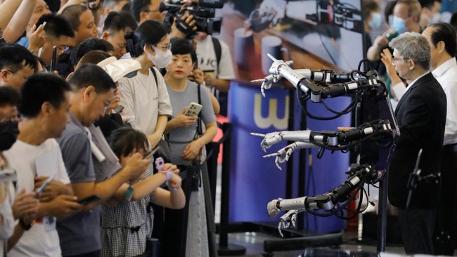 Beijing - Konferensi Robot Dunia (WRC) 2023 dibuka di Beijing. Deretan robot yang mirip manusia mencuri perhatian pengunjung.