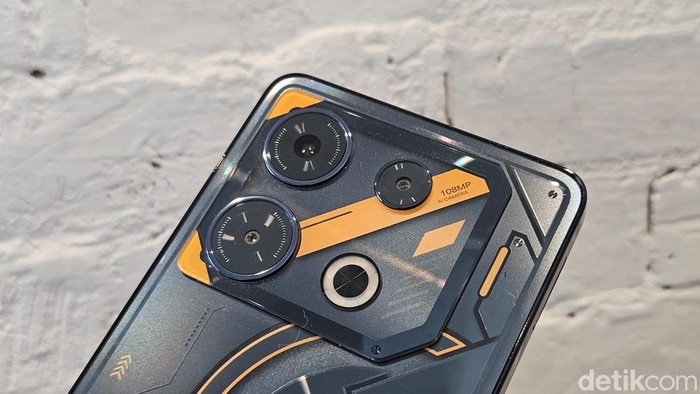 Infinix GT 10 Pro ini memiliki bodi belakang yang mencolok dengan sentuhan Cyber Mecha yang mewakili semangat generasi muda untuk berani tampil beda. Foto: Adi Fida Rahman/detikINET