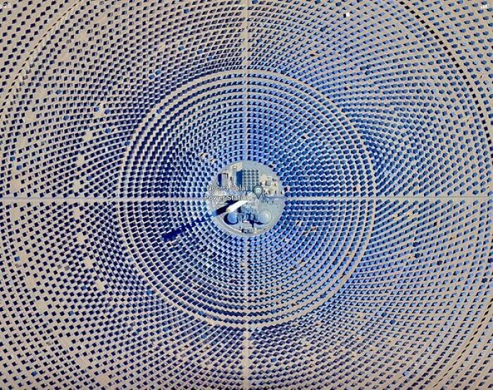 Di Maroko. Cermin Mengarahkan Cahaya Ke Menara, Tempat Cahaya Memanaskan Garam Cair. Garam Cair Menghasilkan Uap untuk Memutar Turbin dan Menjalankan Generator Foto: Boredpanda