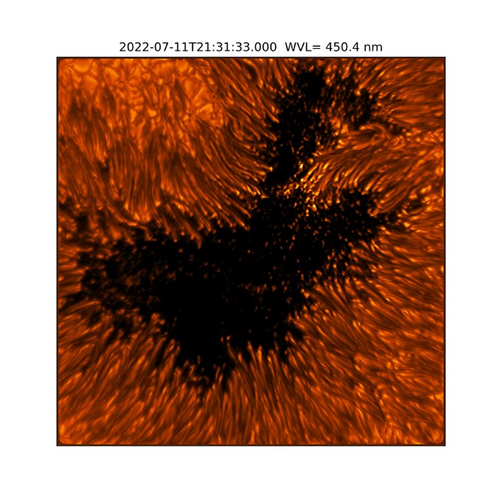 Gambar DKIST menunjukkan bintik mMtahari yang pada akhirnya akan pecah, terlihat dari jembatan cahaya yang membentang melintasi umbra bintik Matahari. Foto: National Solar Observatory