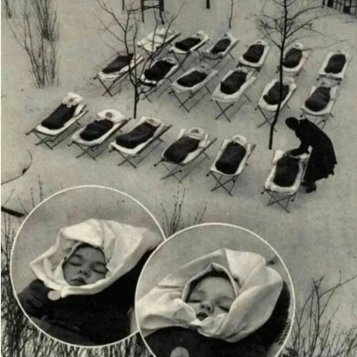 Bayi Dibiarkan Tidur di Luar Dalam Cuaca Dingin, Memperkuat Sistem Kekebalan Tubuhnya, Moskow, Uni Soviet, 1958 Foto: Boredpanda