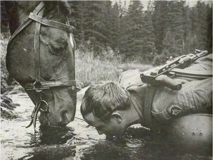 Penjaga Perbatasan Polandia Dan Kudanya Minum Air Dari Sungai Di Pegunungan Bieszczady Saat Patroli, 1980 Foto: Boredpanda
