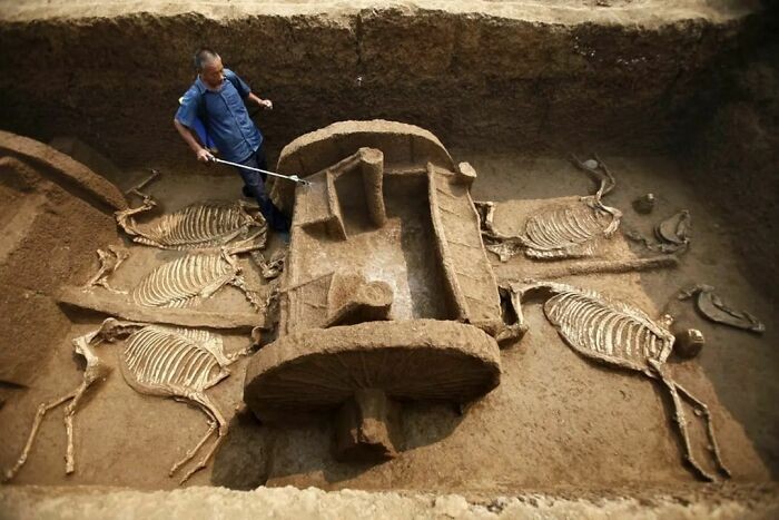 Untuk Melindunginya Dari Kekeringan, Seorang Pekerja Menyemprotkan Air Ke Kereta Berusia Ribuan Tahun Yang Baru-baru Ini Digali Di Kota Luoyang Di Tiongkok Tengah Foto: Boredpanda