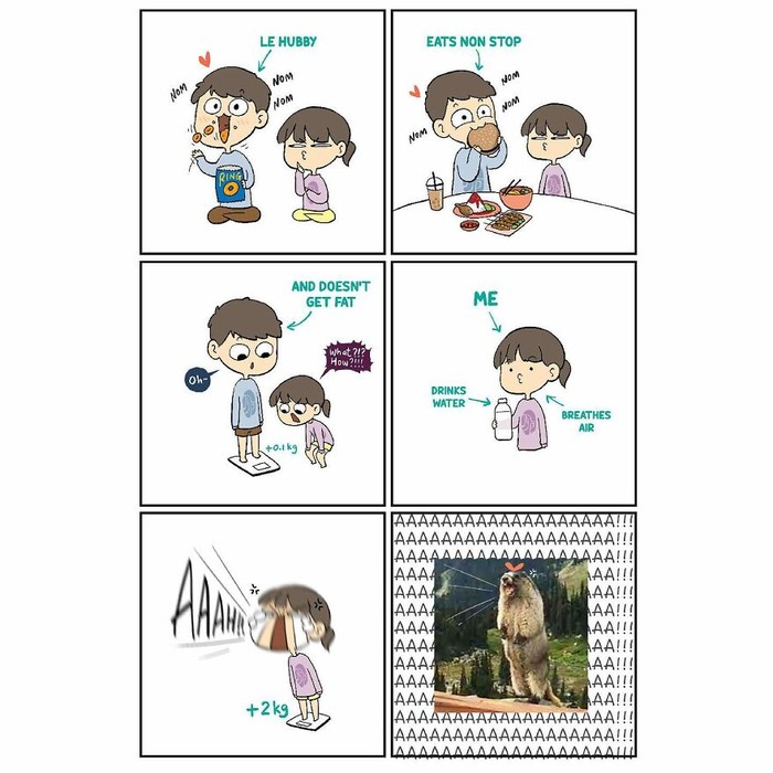Sering terjadi ya. Dia yang makan banyak gak nambah-nambah berat badannya, giliran yang perempuan makan dikit... Ah sudahlah. Foto: (Dok. Bored Panda).