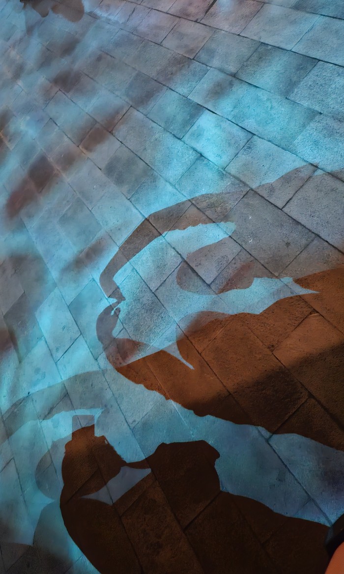 Foto dalam kondisi low light dan di bawah proyeksi gambar dedaunan. Foto: Aisyah/detikINET