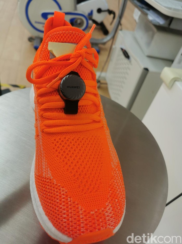 Sepatu yang ditempelkan dengan perangkat kesehatan Huawei, dengan perangkat ini pengguna bisa tahu bagaimana dan berapa ayunan kaki saat berjalan ataupun berlari.Β Foto: Josina/detikcom