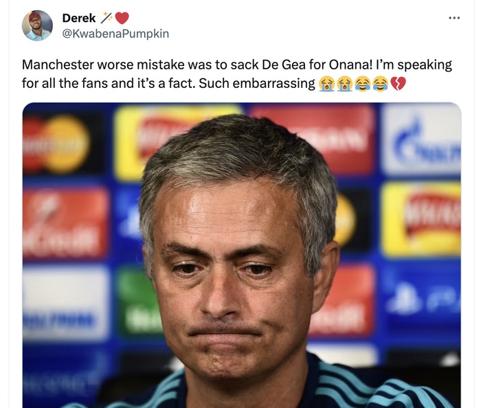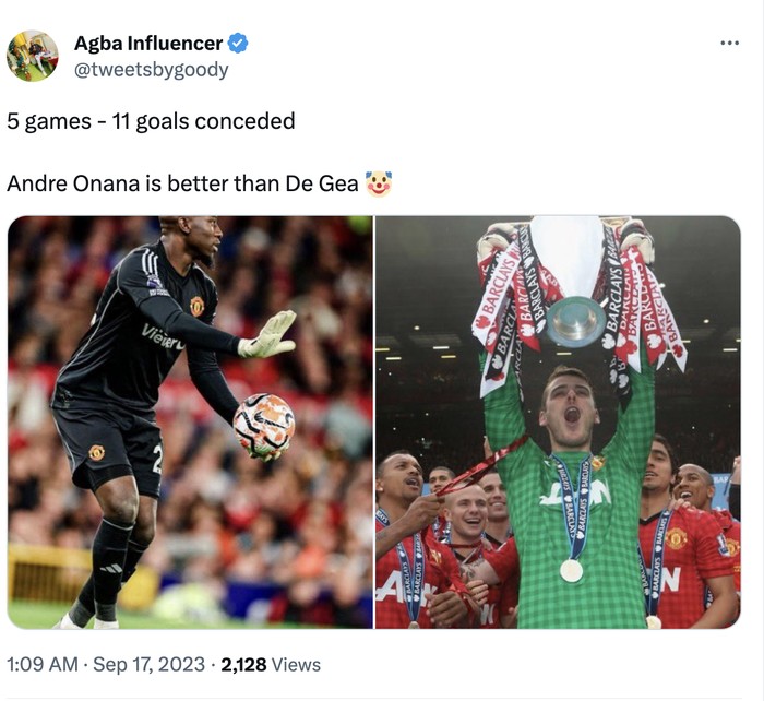 Menurut akun ini, kesalahan terburuk MU adalah memecat David De Gea dan menggantinya dengan Onana. Foto: Twitter