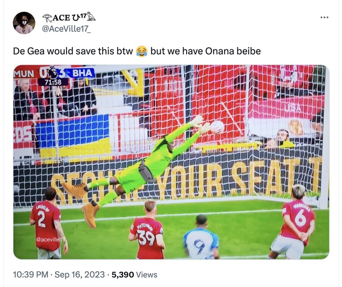 Fans MU berteriak jika Onana berhasil menyelamatkan tendangan, saking langkanya. Foto: Twitter