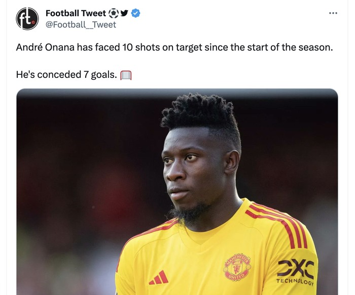 Onana kebobolan lebih banyak gol dari jumlah pertandingan MU. Foto: Twitter