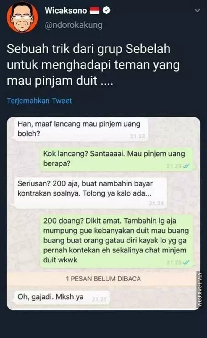 Jangan suuzon duluan. Emang mau pinjam uang kok. Foto: 1cak