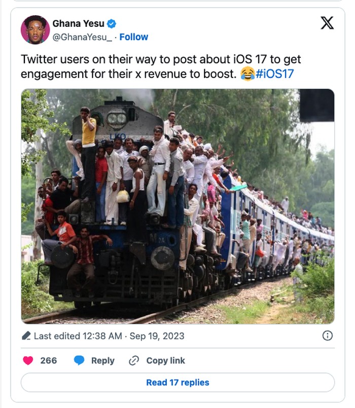 Ramai di medsos pengguna iPhone yang pamer update iOS 17. Foto: Twitter