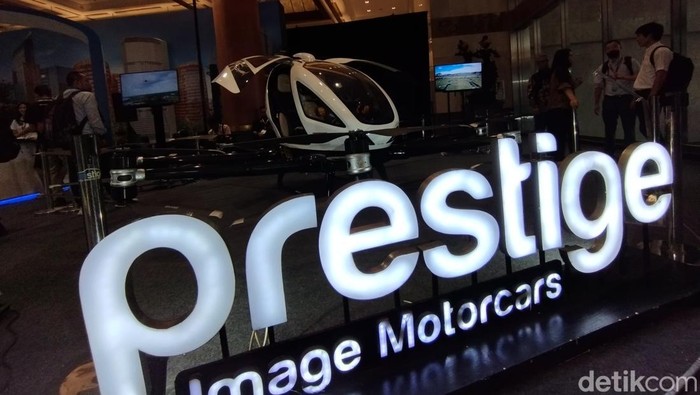 Mobil terbang EHang 216 AAV dipamerkan pada booth Prestige dalam acara Hub Space x KAI Expo 2023 yang diselenggarakan di Jakarta Convention Cente. Foto: Argya Dharma Maheswara/detikcom