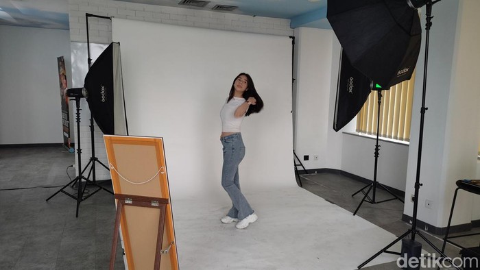 Salah satu siswi sedang membuat konten kreatif. Foto: (Panji Saputro/detikINET)