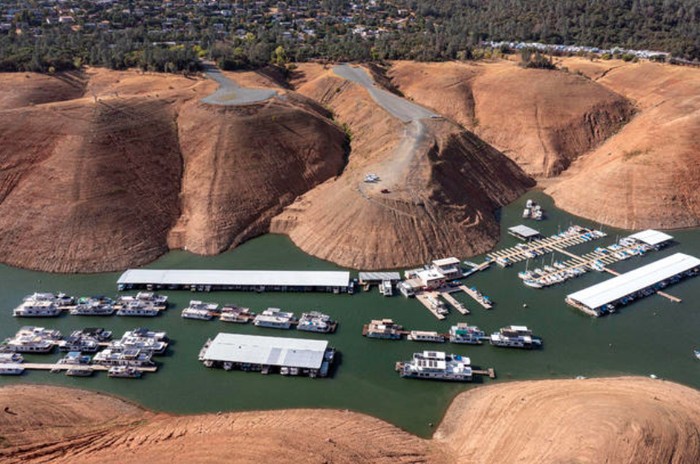 Dalam foto tanggal 11 Oktober 2021 ini, rumah perahu di Danau Oroville di Oroville, California berada jauh di bawah garis pantai lama, sebuah ilustrasi nyata tentang kekeringan bersejarah yang melanda Amerika Barat. Foto: CBS News